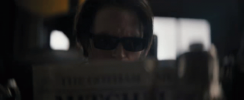 Robert Pattinson as Batman, wearing sunglasses and intently reading a newspaper.