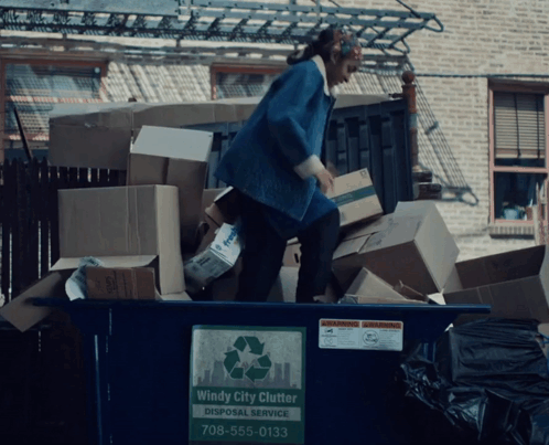 Ayo Edebiri as Syd from The Bear kicks boxes in a 'Windy City Clutter' dumpster, letting out frustration.
