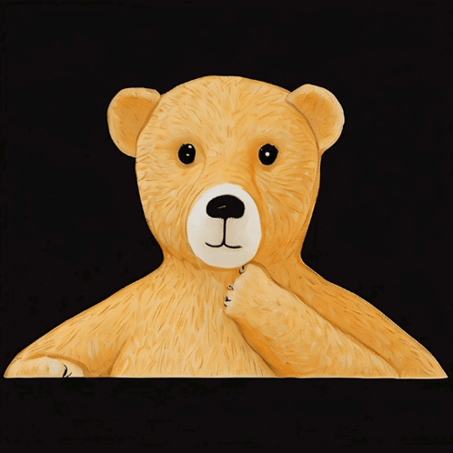 Eddie Edgely, a teddy bear from The Bearton Bears, blinks against a black background.