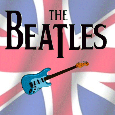 The Beatles logo with a blue electric guitar against a waving Union Jack flag, representing the 60s era.