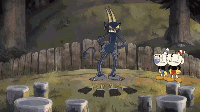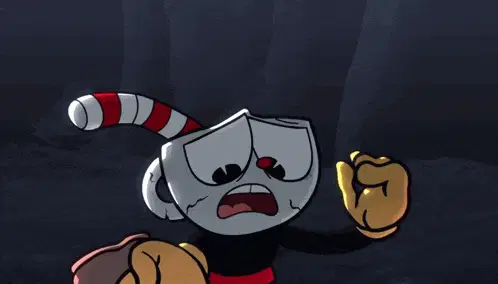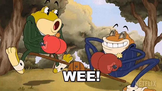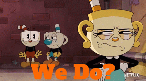 Cuphead, Mugman, and Ms. Chalice from The Cuphead Show reacting with 'We Do?'