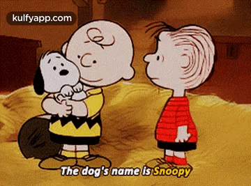 Charlie Brown hugs Snoopy as the text 'The dog's name is Snoopy' appears on screen.