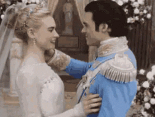 Ella and Prince Charming share a romantic wedding kiss, dressed in their elegant bridal attire amidst floral decorations.