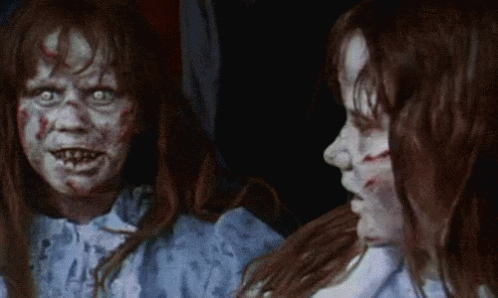 Two girls from The Exorcist appear with terrifying demonic makeup, creating a scary horror scene.