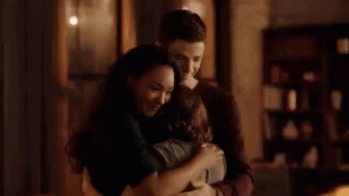 Barry Allen, Iris West-Allen, and Nora share a heartwarming family hug in their living room.