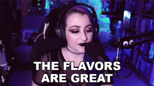 Kayt, wearing headphones and makeup, states 'The Flavors Are Great' into a microphone.