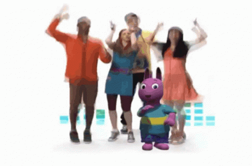 The Fresh Beat Band members jump with Austin from The Backyardigans, celebrating at the Mega Music Fest.