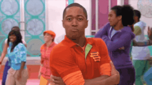 Shout from The Fresh Beat Band, played by Thomas Hobson, stands with arms crossed and a pouting expression.