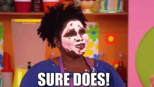 Dioni Michelle Collins from The Fresh Beat Band with a cream mask on her face, saying 'Sure Does!'