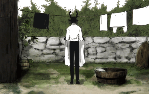 A horned character from Nagabe's 'The Girl From The Other Side' anime hangs laundry in a rustic yard.
