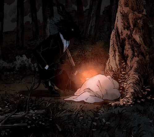 An animated drawing of a man in a suit standing next to a tree with a light emanating from it, from 'The Girl From The Other Side Nagabe'.