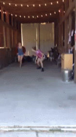 Two girls run through a barn, followed by a playful stampede of baby goats.
