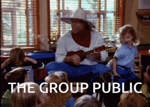 A man in a cowboy hat plays a ukulele for a group of children, with the text 'THE GROUP PUBLIC' displayed.
