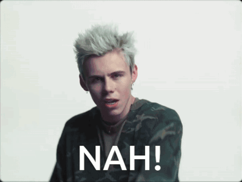 The Kid Laroi pointing at the camera with the word 'NAH!' displayed below him, from his 'Too Much' music video.