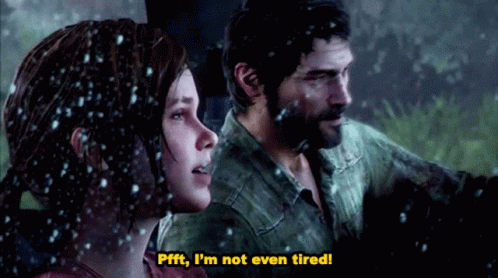 Ellie and Joel from The Last of Us in a snowy scene, with Ellie declaring, 'Pfft, I'm not even tired!'