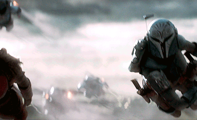 Bo-Katan Kryze, played by Katee Sackhoff, flying with the Darksaber in The Mandalorian.