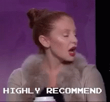 A woman from The Morning Breath show, wearing a fur coat, enthusiastically says 'Highly Recommend' while holding a coffee cup.
