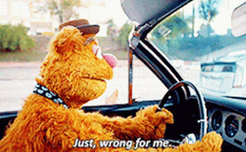 Fozzie Bear from The Muppets drives a car, humorously stating, "Just, wrong for me."