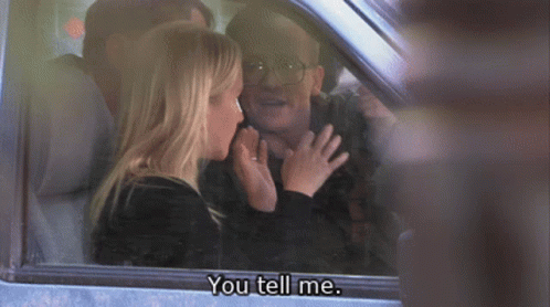 Trevor and Angela from The Office in a car, with Trevor saying 'You tell me'.
