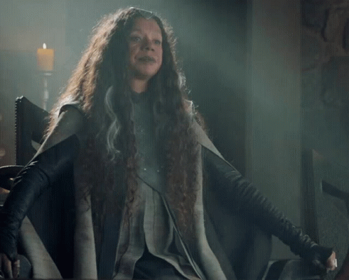 Jaye Griffiths as Yavalla, the prophetess from The Outpost series, making a hand gesture.