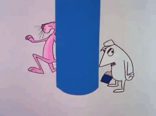 The Pink Panther playfully paints a blue pillar pink, much to the annoyance of a small white character.