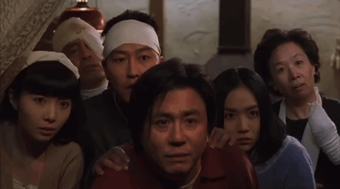 The Quiet Family, including Choi Min-sik and Song Kang-ho, stands with shocked expressions, looking intently.