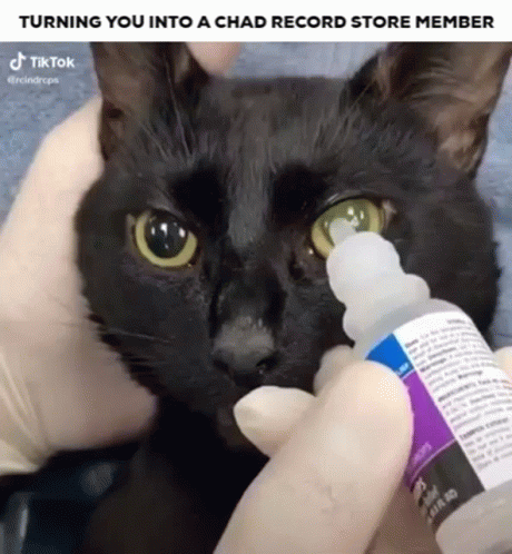 A black cat receives eye drops, humorously captioned as becoming a 'Chad Record Store Member'.