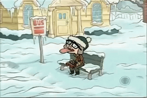 Shelton Klutzberry from Disney's The Replacements plows snow, clearing a path near a bus stop.
