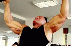 The Rock performing an intense pull-up exercise in a gym, showcasing his muscular physique and strength.
