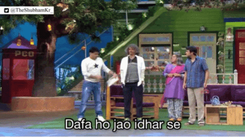 Kapil Sharma points and tells someone to 'Dafa ho jao idhar se' (Get lost from here) on The Kapil Sharma Show, featuring Sunil Grover.