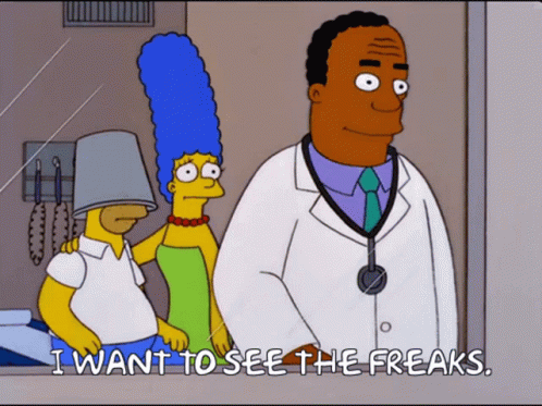 Homer Simpson, with a bucket on his head, declares 'I want to see the freaks' while Marge and Dr. Hibbert look on.