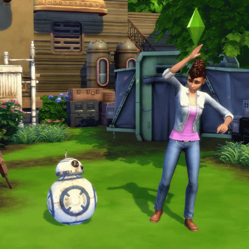 A Sims 4 character performs a happy dance alongside a BB-8 droid in a Star Wars-themed setting.