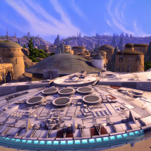 The Millennium Falcon from Star Wars flying over the fictional planet Batuu in The Sims 4 game.