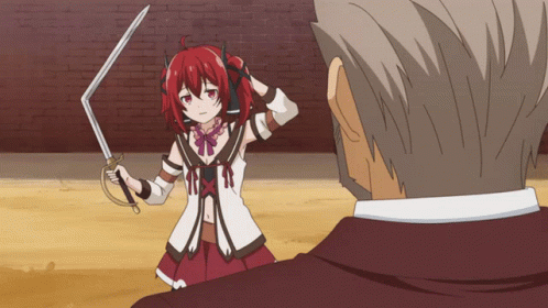 Iris from The Strongest Sage With The Weakest Crest looks confused, holding a comically bent sword in front of an older man.