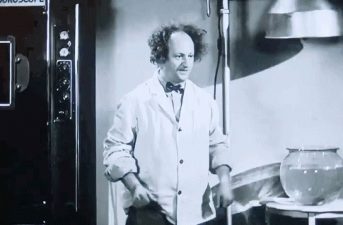 Larry from The Three Stooges performs a lively dance, then comically slips and falls in a lab coat.