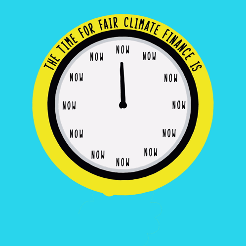 Animated clock with 'NOW' on its face, emphasizing 'The Time for Fair Climate Finance Is Now' for Bahamas Forward.