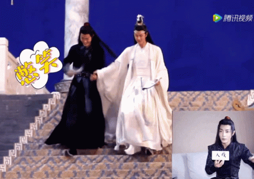 Xiao Zhan as Wei Wuxian and Wang Yibo as Lan Wangji from The Untamed, sharing a funny behind-the-scenes moment.