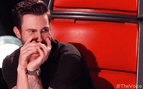Adam Levine from The Voice laughing heartily, covering his mouth with his hands while sitting in a red coach chair.