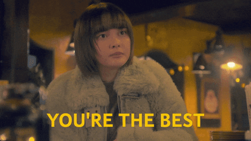 Tina Tamashiro from The Way Of The Househusband looking surprised with 'YOU'RE THE BEST' text displayed.