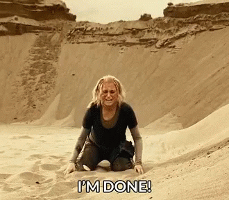 Clarke Griffin from The 100 kneels in a desert, screaming 'I'M DONE!' in an emotional moment.
