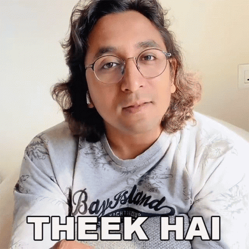 Appurv Gupta, wearing glasses and a Bay Island sweatshirt, looks at the camera and says 'Theek Hai' (Okay).