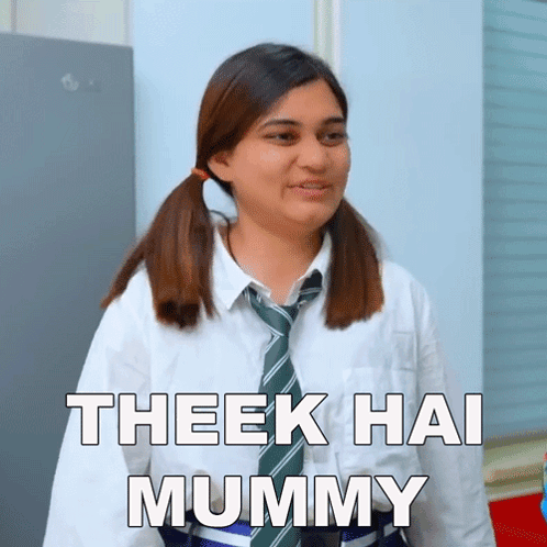 Nancy, a girl in a school uniform, says 'Theek Hai Mummy' (Okay, Mom) with a smile.