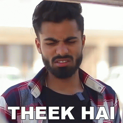 Rahul Jha makes a funny face with the caption 'Theek Hai', wearing a plaid shirt.