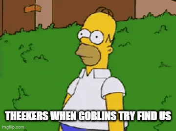 Homer Simpson as a 'Theeker Goblin' quickly vanishes into the grass to hide from pursuers.