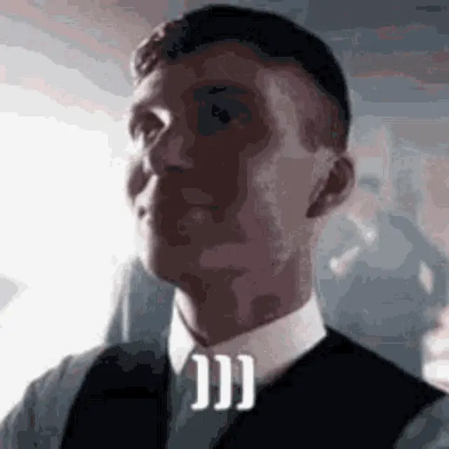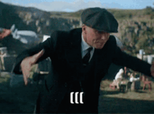 Thomas Shelby, in his signature suit and flat cap, moves intensely outdoors in a rugged landscape.