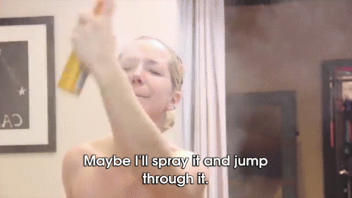 Jenna Marbles sprays fake tan, contemplating jumping through the mist as she holds the spray can.