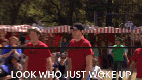 Jim Halpert from The Office behind a volleyball net, with the caption 'LOOK WHO JUST WOKE UP'.