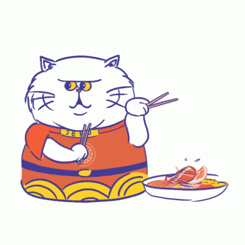 Jero the Fortune Cat, wearing traditional attire, skillfully eats a delicious bowl of lou sang with chopsticks.