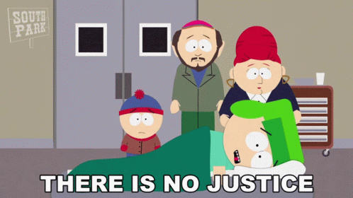 Stan Marsh, Kyle, Gerald, and Sheila Broflovski in a South Park hospital scene, exclaiming 'There Is No Justice'.