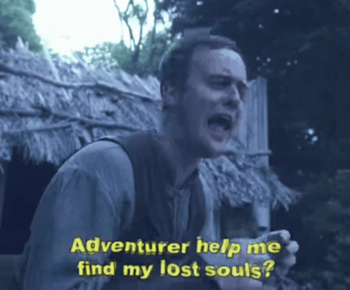 Alan from Thevldlsquad desperately asks an adventurer to help find his lost souls in front of a thatched hut.